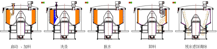 電機(jī)帶動(dòng)皮帶輪驅(qū)動(dòng)轉(zhuǎn)鼓繞自身軸線高速回轉(zhuǎn),物料在預(yù)先編制的程序控制下,通過(guò)進(jìn)料系統(tǒng)進(jìn)入高速旋轉(zhuǎn)的轉(zhuǎn)鼓內(nèi)。在離心力的作用下,物料均布在過(guò)濾介質(zhì)上進(jìn)行脫液分離,液相透過(guò)固相物料和濾網(wǎng)縫隙,經(jīng)鼓壁孔甩至機(jī)殼空間,從出液口排出機(jī)外,固相物料截留在轉(zhuǎn)鼓內(nèi)形成濾餅。料層檢測(cè)裝置實(shí)時(shí)檢測(cè)物料的充填位置,當(dāng)濾餅達(dá)到事先設(shè)定的位置時(shí),自動(dòng)關(guān)閉加料閥,停止進(jìn)料,然后對(duì)濾餅進(jìn)行洗滌、脫水,待達(dá)到要求后,離心機(jī)降到卸料速度,刮料器在液(氣)動(dòng)控制下將濾餅刮下,經(jīng)轉(zhuǎn)鼓底上的出料口卸出。離心機(jī)繼續(xù)降速,氣動(dòng)拉袋裝置上下快速往復(fù)運(yùn)動(dòng),將殘余濾餅抖落,實(shí)現(xiàn)濾餅的完全清除。