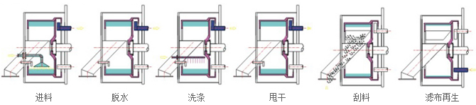 電機帶動皮帶輪驅動轉鼓繞自身軸線高速回轉,反沖管向虹吸室內灌液排除虹吸管內的空氣,物料在預先編制的程序控制下,通過進料系統進入高速旋轉的轉鼓內。在離心力和虹吸抽離的雙重作用下,物料均布在過濾介質上進行脫液分離,液相透過固相物料和濾網縫隙,經過濾內轉鼓壁孔和虹吸室的通孔進入虹吸室,再由虹吸管抽走排出機外,固相物料截留在過濾轉鼓內形成濾餅。料層檢測裝置實時檢測物料的充填位置,當濾餅達到事先設定的位置時,自動關閉加料閥,停止進料,然后對濾餅進行洗滌、脫水,待達到要求后,離心機降到卸料速度,卸料閥打開,刮料器在液動控制下旋轉上升,將濾餅刮下掉進螺旋出料器,經出料閥排出機外。
